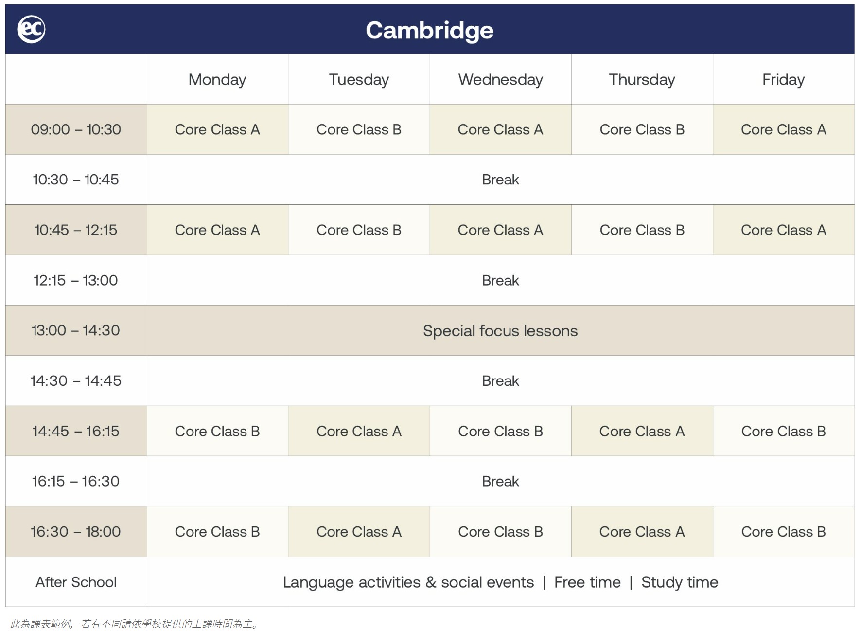 所有一般英語課程皆包含20堂綜合技能課程Core Class,每週修讀24、26或30堂課的學生,也可以從一系列專業技能課程(選修)Special Focus Class中進行選擇,進一步提升你的英語各項技巧與溝通的能力。