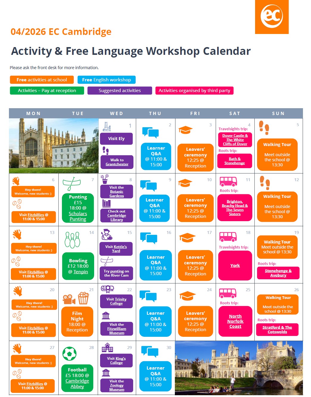 我們設計的活動讓你能全方位體驗這座城市的魅力,同時與來自世界各地的同學一起練習英文、拓展人脈。平日有免費的語言工作坊與活動,讓你能學習新詞彙並實際在日常生活中運用,週末也有短程或長途的旅遊,玩得開心也能持續學習!