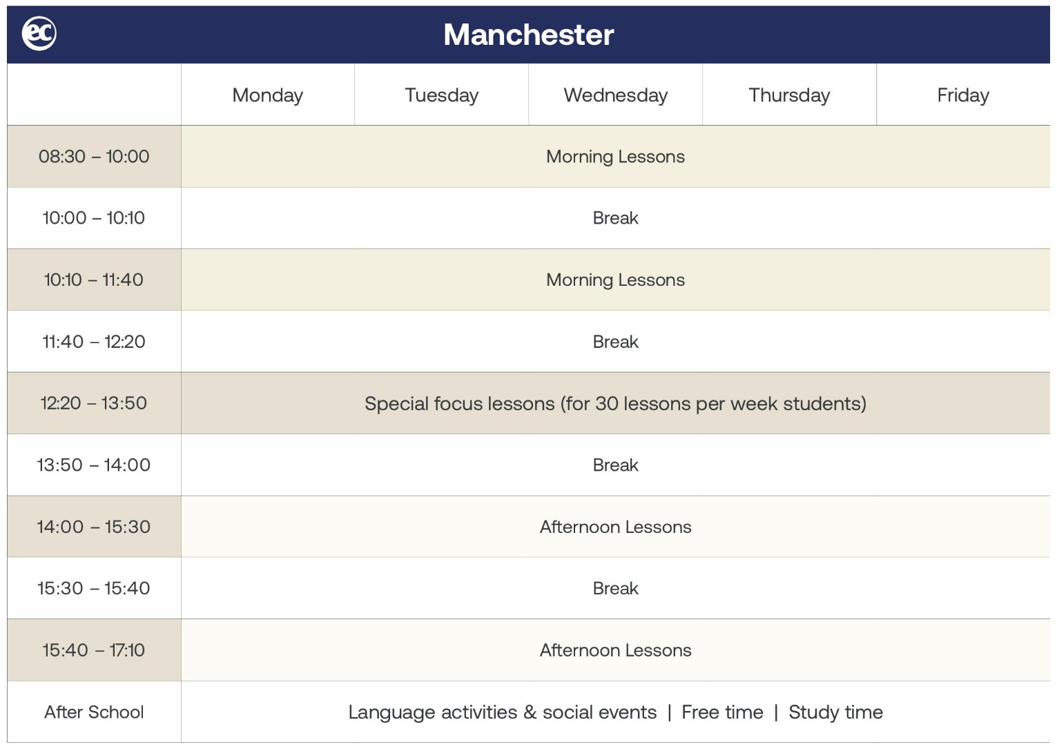 曼徹斯特是英國最具活力的學生城市之一,有「世界第一個工業城市」的稱號,散發著年輕活力,擁有充滿生命力的音樂文化,以及世界級的足球隊,當地居民以熱愛足球聞名。課後可以參觀兩大頂尖足球隊的球場:曼聯Manchester United和曼城Manchester City!也可造訪科學與工業博物館,或欣賞現場音樂表演。其他著名的景點都在EC語言學校曼徹斯特分校附近,學校提供多樣化課程,適合希望提升英文能力並深入體驗曼徹斯特遊學生活的學生。