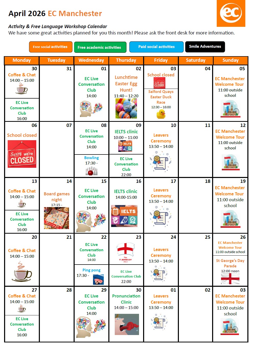 我們設計的活動讓你能全方位體驗這座城市的魅力,同時與來自世界各地的同學一起練習英文、拓展人脈。平日有免費的語言工作坊與活動,讓你能學習新詞彙並實際在日常生活中運用,週末也有短程或長途的旅遊,玩得開心也能持續學習!
