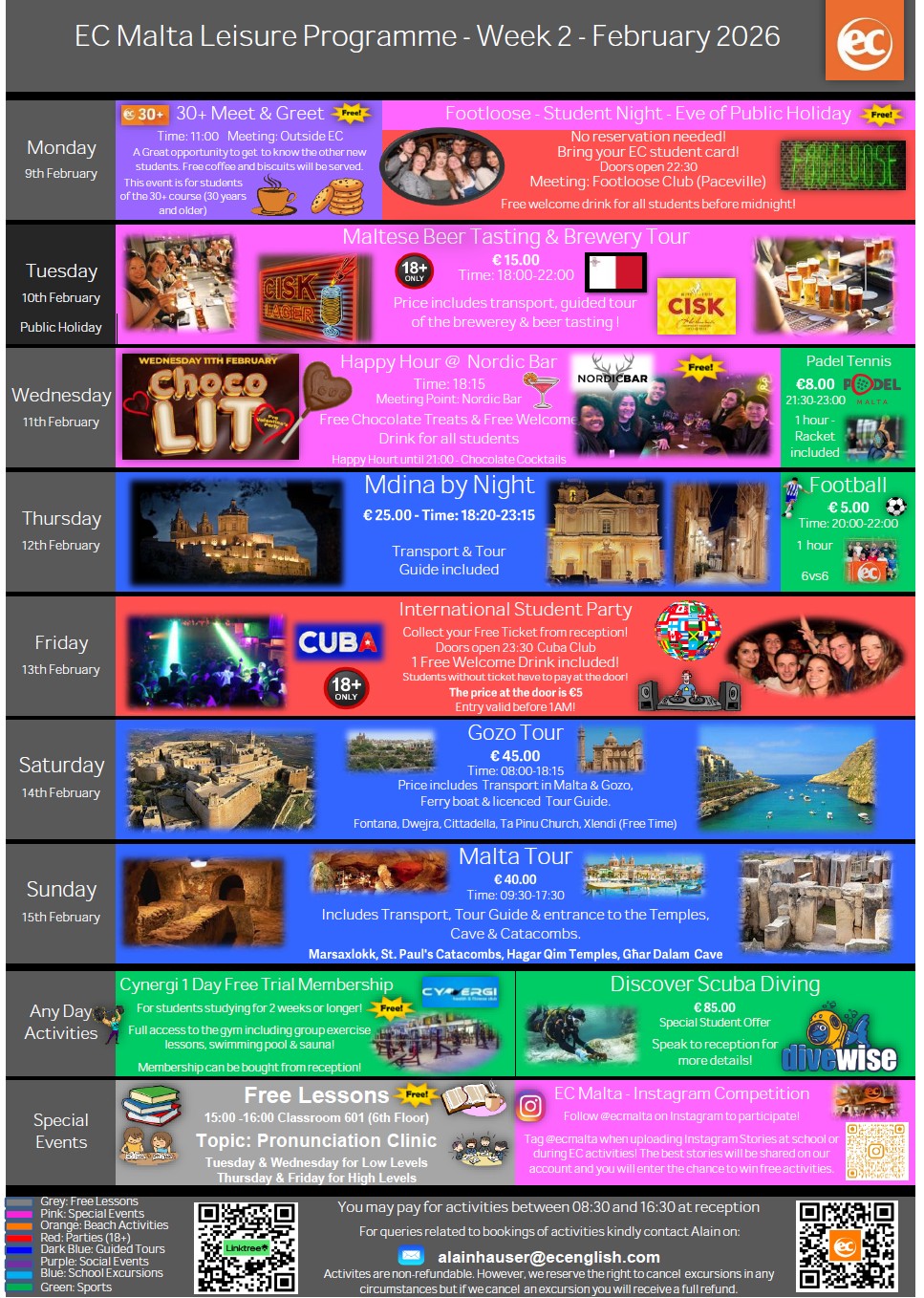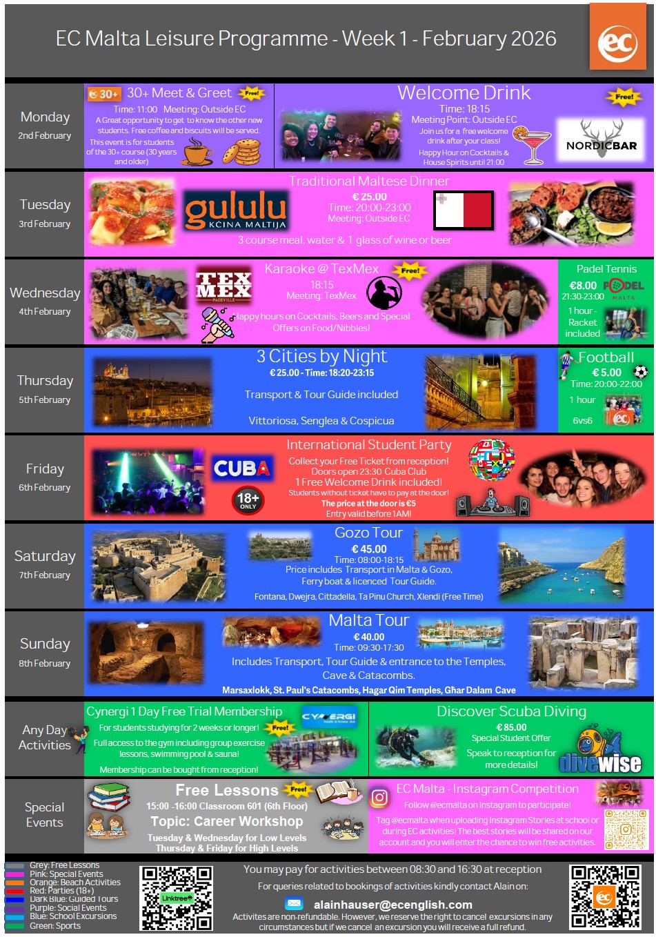 EC語言學校馬爾他校區提供各類英文課程,無論是短期遊學、加強密集英文能力,都能在這裡找到適合自己的課程。你可以在課餘時間前往陽光海灘放鬆,在清澈純淨的海水中體驗水肺潛水,或是安排前往科米諾島Comino的一日遊,參觀歷史古城姆迪納Mdina 與首都瓦萊塔Valletta兩座城鎮,深入體驗這座城市的文化魅力。