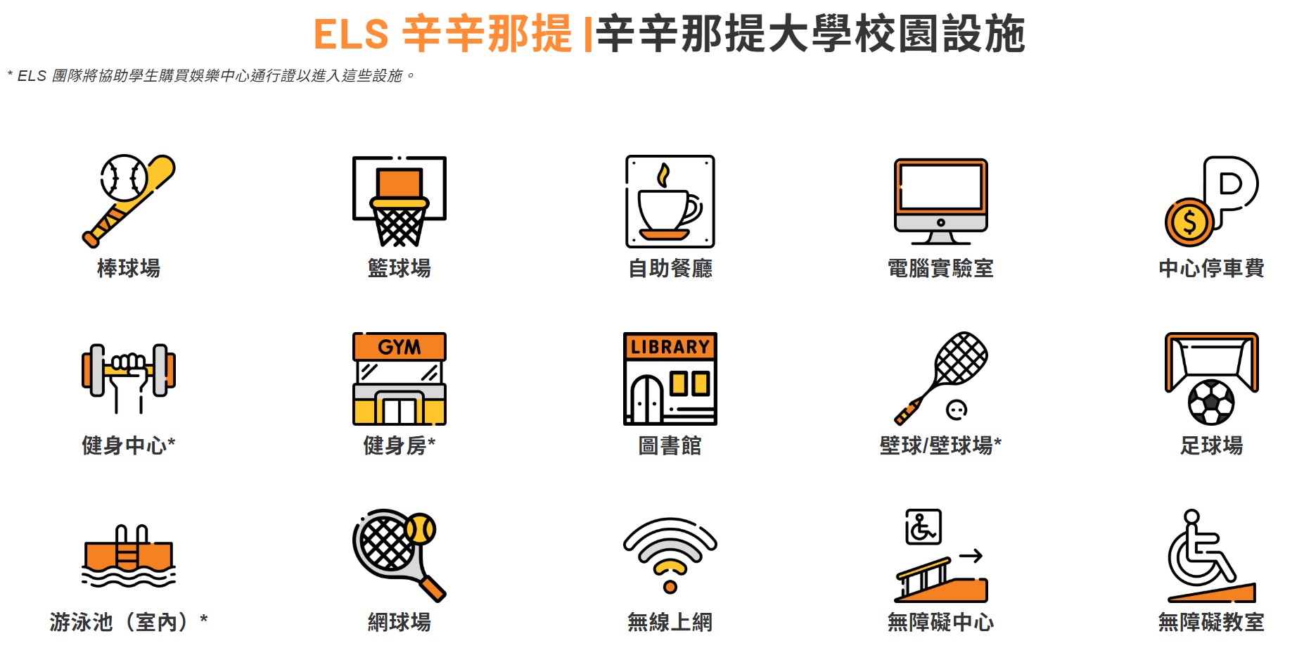 ELS辛辛那提校區位於辛辛那提大學校園內,讓你能體驗真實的美國大學生活。這所大學被譽為全球最美校園之一,也是名列全美前150名的大學,並由美國國家科學基金會NSF評選為全美前25名公立研究型大學之一。ELS語言學校的學生可在校內餐廳用餐,並加購校內運動休閒中心Rec Center使用證,使用包含室內攀岩牆、六面籃球場、跑道、游泳池等在內的頂級健身設施。