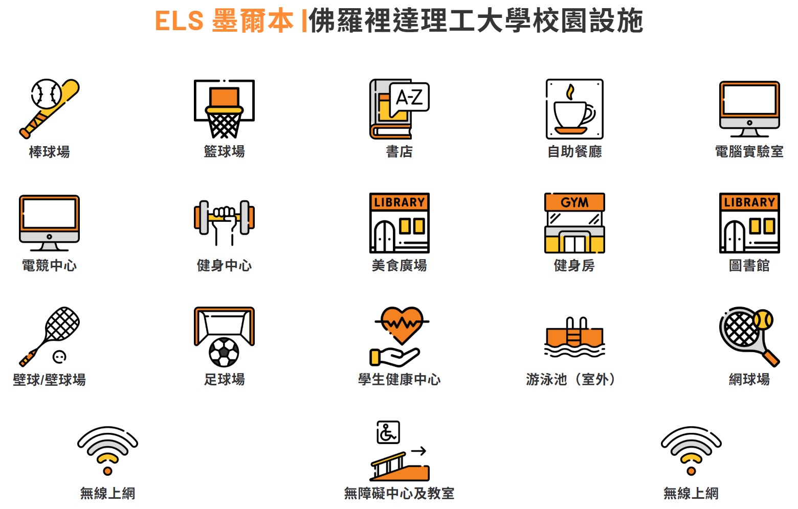 ELS墨爾本校區位於佛羅里達理工學院校園內,ELS語言學校的學生有機會可與FIT的在校學生互動交流,並使用多項校園設施與資源,完整體驗美國大學校園生活。佛羅里達理工學院被譽為全美最美校園之一,是一所Tier 1等級的大學與研究機構,該校最初為培育太空計畫先驅而成立,如今提供完整且多元的STEM(科學、科技、工程與數學)相關課程及其他學術領域。