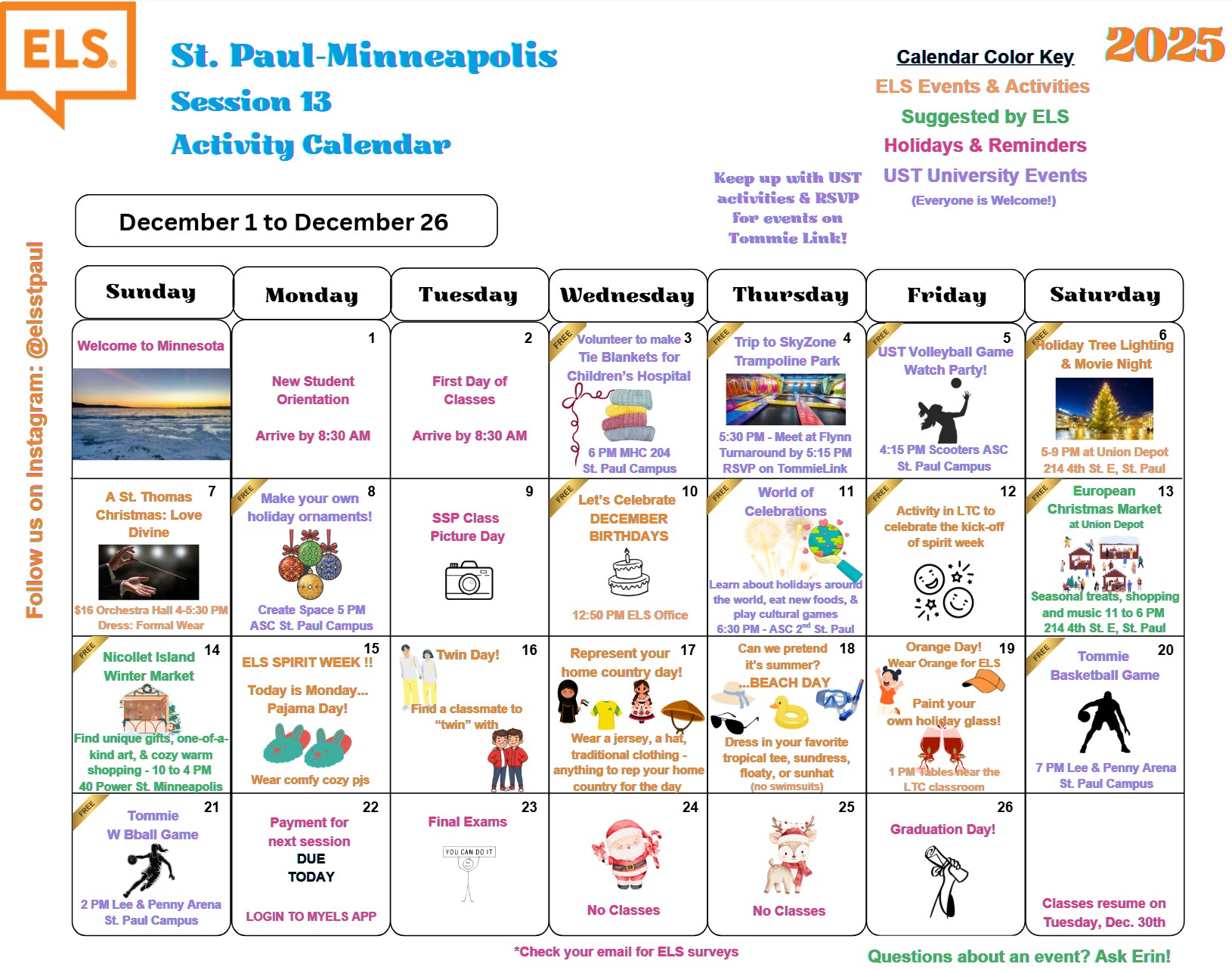 ELS 聖保羅-明尼亞波利斯校區為一所設立於聖湯瑪斯大學校園內的語言學校,學生有機會可與美國在校生互動交流,體驗真實的大學生活。聖湯瑪斯大學為一所私立天主教大學,名列全美前150名大學,也是明尼蘇達州規模最大的私立大學。大學校園橫跨聖保羅與明尼亞波利斯兩座城市,校內學生來自全美50州及全球63個國家,校園文化多元、國際化程度高。