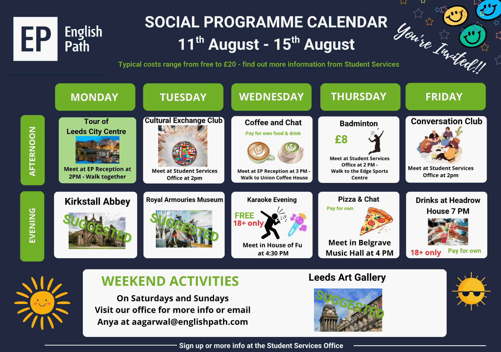 活動涵蓋各種興趣,從酒吧巡禮、博物館參觀,到戲劇觀賞與週末小旅行應有盡有。我們也提供多項免費活動,確保每位學生都能參與其中、盡情享受樂趣!