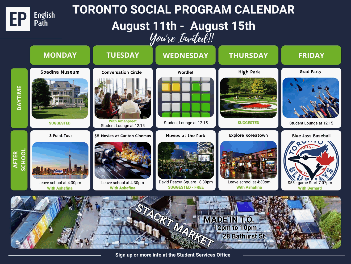 EP 致力於為學生提供全面的學習體驗,除了課程之外,我們也設計了充滿活力的社交活動,讓學生能探索城市、並結交來自世界各地的朋友,我們鼓勵所有學生積極參與!