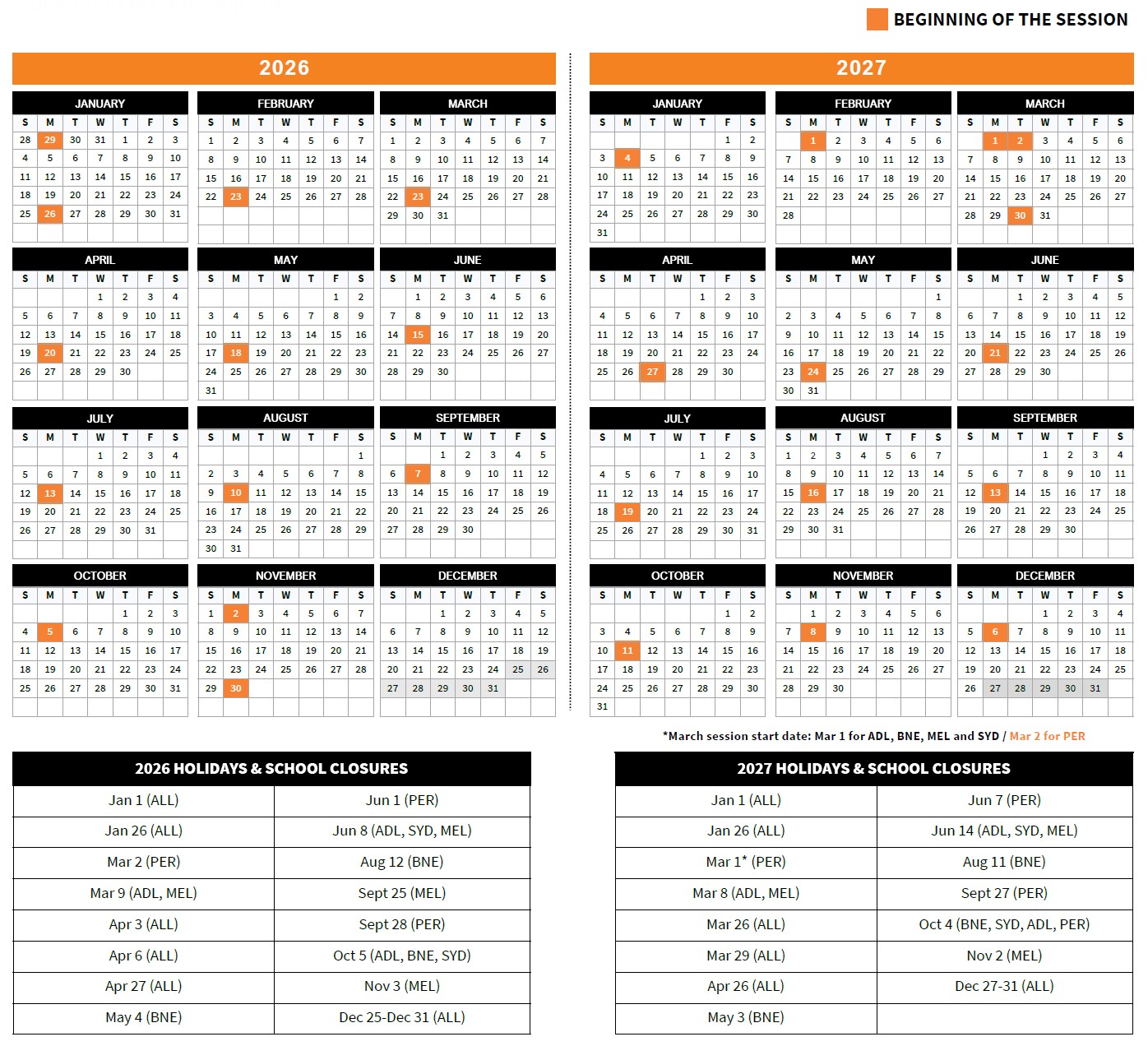 開課日期:每週一,因所有課程為4週一期,為了獲得最佳體驗,建議盡可能在以下年曆的橘底色為主要建議開課日入學,不建議在每一期的最後一週也就是第4週入學。