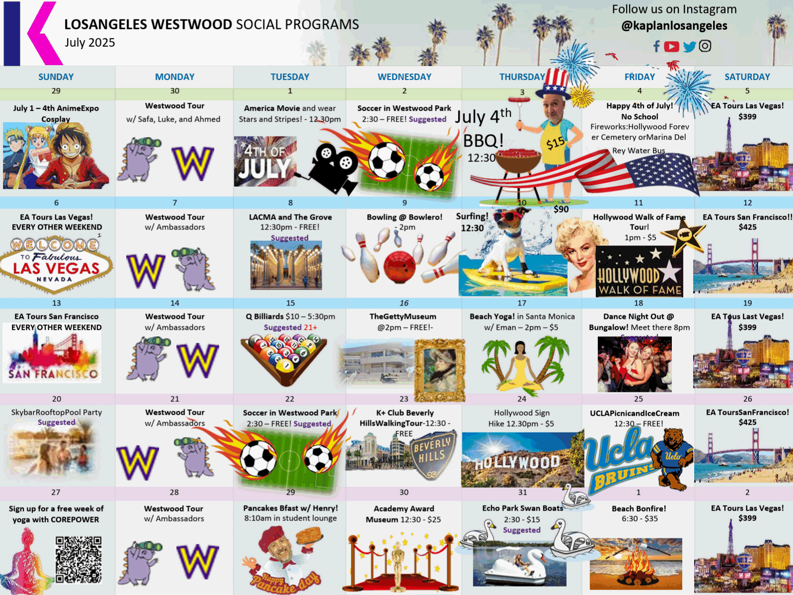 Kaplan語言學校的洛杉磯校區位於熱鬧的西木區,地點絕佳,步行約15分鐘即可抵達UCLA校園。這所語言學校交通便利,搭乘公車就能輕鬆前往聖塔莫尼卡海灘、好萊塢等熱門景點。無論是希望提升英文能力,還是想深入探索美國西岸文化,來這裡遊學都是一段難忘的學習旅程。