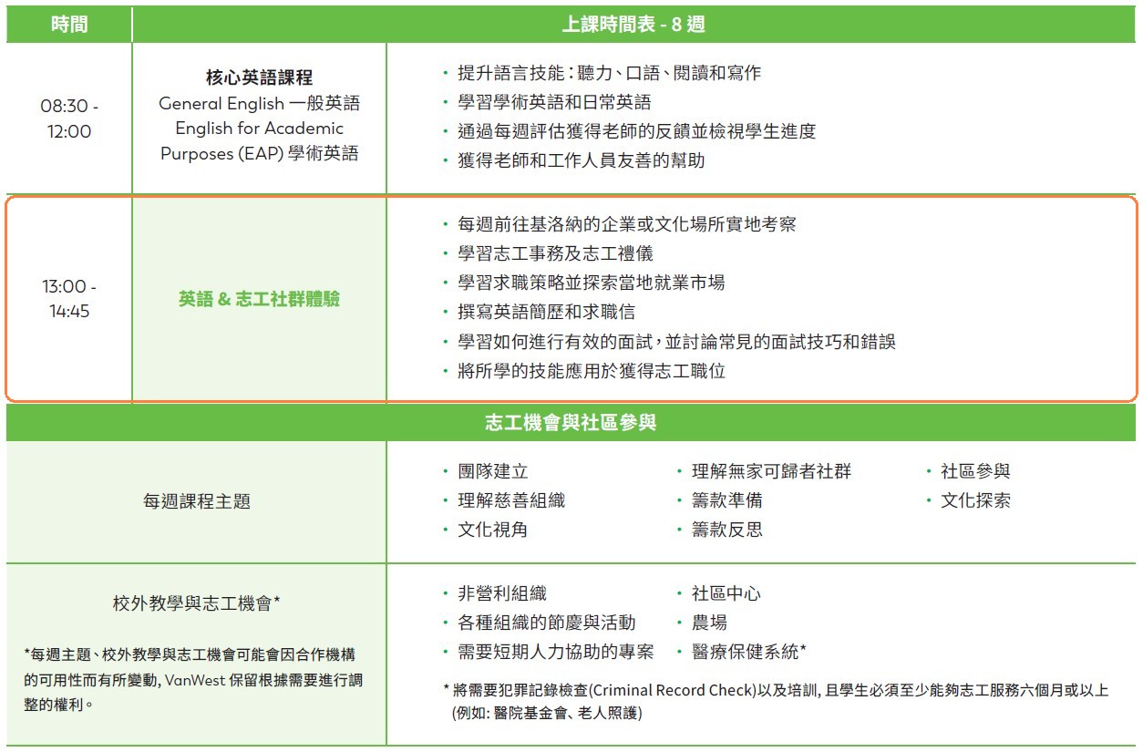 這是一門高度互動、以社區為基礎的課程,教導學生如何參與當地社區、學習新技能、獲得「加拿大式」的實務經驗。