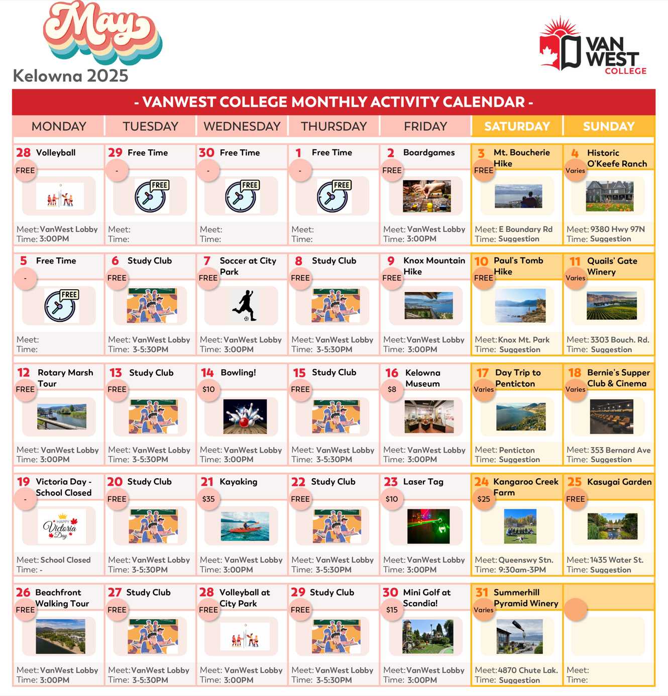 Vanwest語言學校位於基洛納市中心,是當地評價極高的語言學校之一。交通便利、鄰近餐廳、咖啡廳、購物中心、湖濱步道與各大公園,讓你在加拿大遊學期間能同時享有自然景觀與都市機能的雙重體驗。校區屬於小而精的溫馨規模,學生總人數約120人左右,適合希望在更專注的學習環境中提升英文能力的學生。