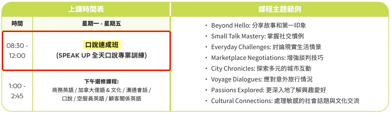 學生可參與早上口說速成班並搭配下午2節不同之口說選修課程,有別於以往訓練不同英語技能,僅透過全日口說訓練來增加口語表達能力!